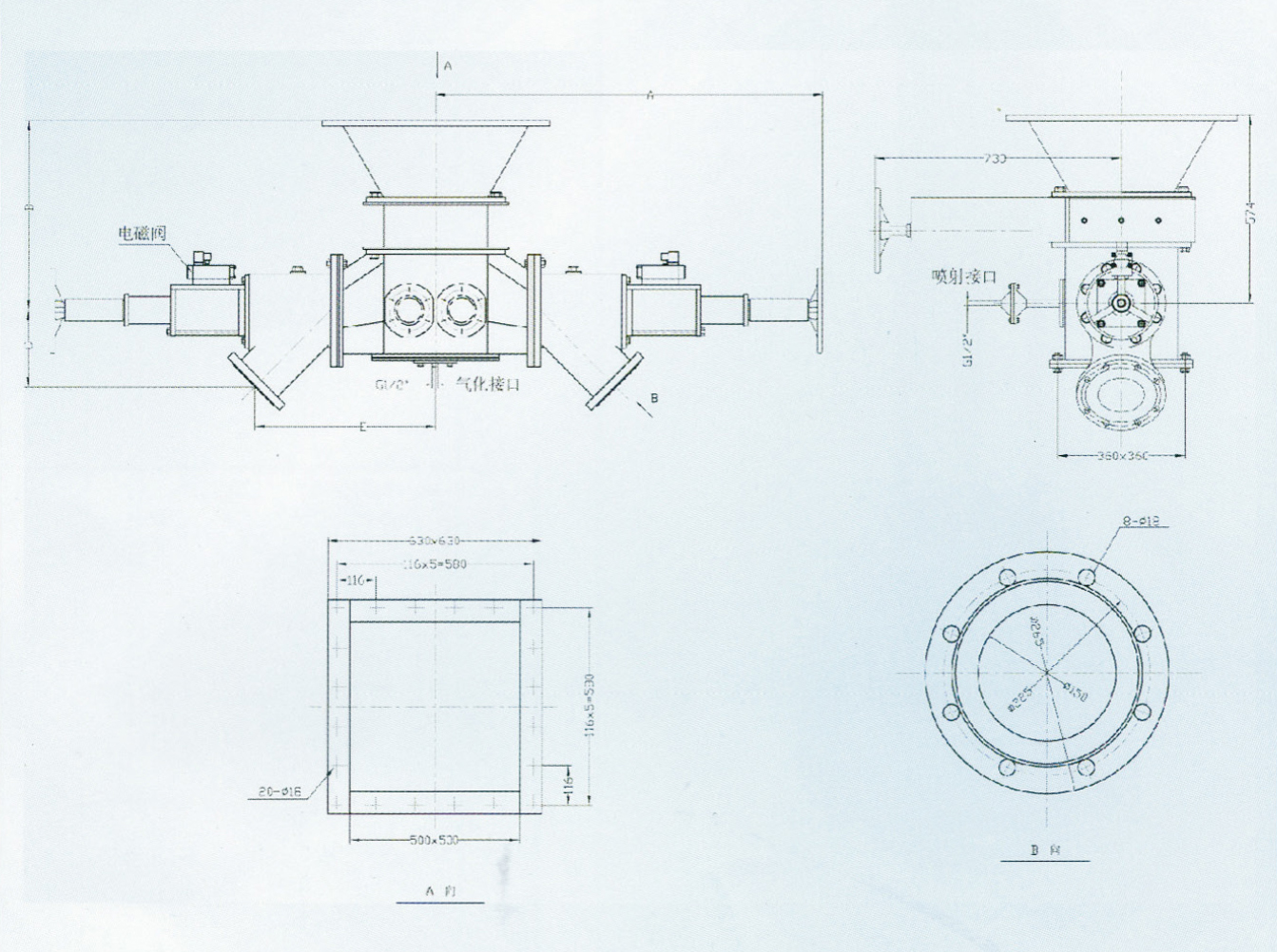 該設備用于粉料貯倉底部或側面卸料用,設備帶有流化裝置,卸料時能使物料流態化排出,通過輸送管道或斜槽,配合散裝機直接裝料,該系統有氣動和手動兩種控制方式,氣動用電磁閥控制氣缸伸縮運動,實現卸料閥門的啟閉;手動為轉動手輪啟閉閥門。